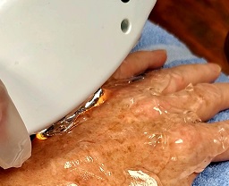 The light is so bright you can’t look at it, even with special glasses worn by everyone in the room. To make sure we weren’t blinded, the therapist counted down, three – two – one, and we all closed our eyes. She pulled the trigger on the gun, and that’s what it felt like, a gunshot. They say it’s just a snap on your skin. On my skin, it hurt like hell. Ever get snapped very hard across the back of your hand with a thick, hot rubber band?